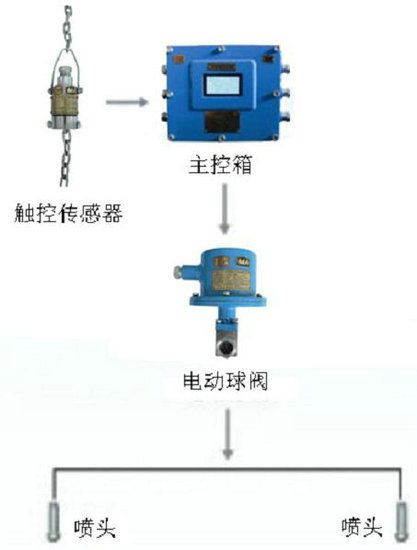 當(dāng)皮帶運(yùn)輸機(jī)輸煤時(shí),煤流觸動(dòng)傳感器探桿,觸控傳感器接收到信號(hào)觸發(fā)主控箱控制電路,打開電動(dòng)球閥,裝置自動(dòng)灑水降塵,無物料時(shí)延時(shí)一段時(shí)間后停止噴霧(延時(shí)可調(diào))。